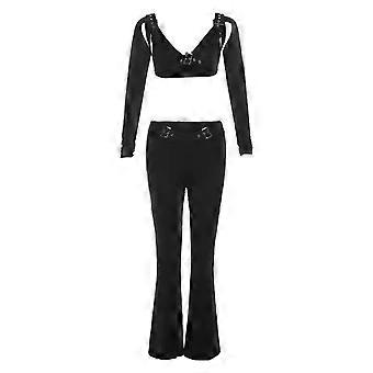 Women's 2 Piece Outfits Casual Long Sleeve Crop Tops Shirt Long Flared Pants Trousers Lounge Set Sweatsuit Streetwear Black S