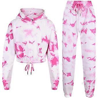 Girls Tie Dye Printed Pink Cropped Hoodie & Bottom Tracksuit