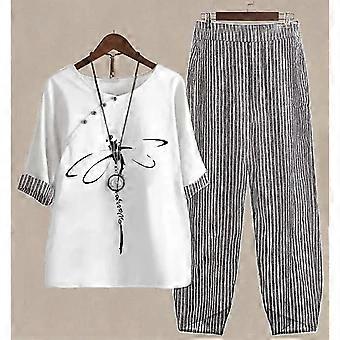 Summer 2 Piece Set Women Loose Short Sleeve Shirt Top High Waist Pants Flower Print Outfits Ladies Elegant Vintage Suit Fall