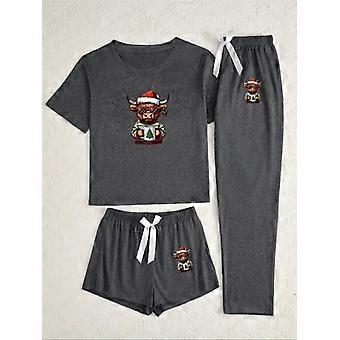 Women's Christmas Highland Cow Print Round Neck Short Sleeve Top & Bow Waist Shorts Set, Casual Comfortable Home Wear