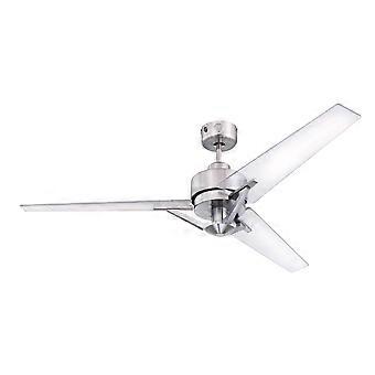 Dimensions and technical details 220-240 V ~ 50 Hz Diameter: 137cm / 54"  Housing colour: brushed nickel (metal) Blade colour: clear (acrylic) Blade pitch: 12° Motor wattage: 17 / 29 / 57 W Revolutions per minute: 96 / 137 / 194 Max. airflow rate: 184 m³/min / 6497 cfm Noise level: 56 dB(A) Ceiling to blades: 31.3cm / 12.3" Overall drop: 41.8cm / 16.5" Diameter canopy: 13cm / 5.1" Max. ceiling slope: 15° Manual reversing switch for summer and winter mode on the housing  Includes remote control: 3 fan speeds / off  Weight: 8.5kg / 18.7lbs