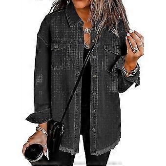 Denim Jean Jacket with Oversized Button-Up Frayed Hem and Long Sleeve Pockets