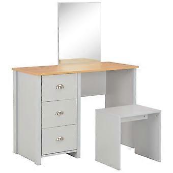 Colour: Grey + natural wood colour Material: Engineered wood with melamine Overall dimensions: 104 x 45 x 131 cm (L x W x H) Mirror dimensions: 47 x 56 x 3 cm (W x H x T) Stool dimensions: 44 x 32 x 43.5 cm (L x W x H) With 3 drawers WARNING: