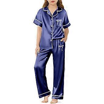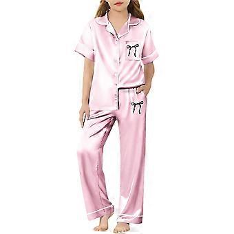Short Sleeve Pants Set Girls Two Piece Outfits Silk Satin Bow Print Button Down Collared Shirts Girl Home Clothes Kids 3-14 Years Trendy Outfit
