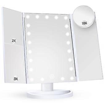 Multiple Magnification With 1X/2X/3X/10X magnification, this mirror ensures detailed viewing of facial features. Touch Screen Control The touch screen allows for easy adjustment of the LED lights, offering convenience and control. LED Night Light Equipped with 22 built-in LED lights, this mirror provides adjustable brightness for use in low-light conditions. Foldable Design The tri-fold design allows for easy storage and portability, making it perfect for touch-ups on the go. Portable Size Its compact size makes it ideal for travel and easily fits into handbags or makeup kits.