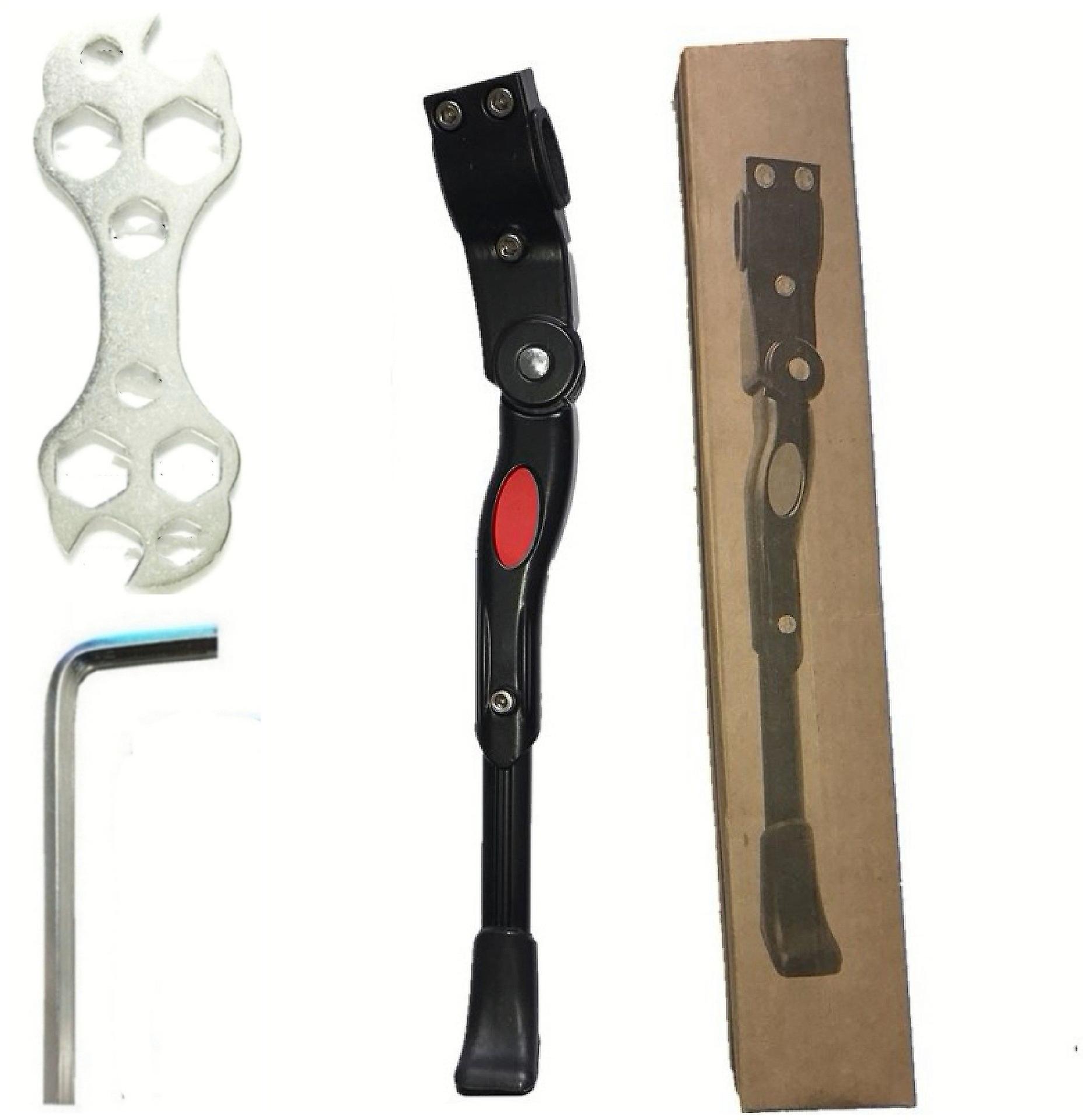 Håll din mountainbike säker och stadig med cykelstativet. Dess justerbara längd och robusta konstruktion ger det nödvändiga stödet för att förhindra att din cykel välter. Med de medföljande skiftnycklarna kan du enkelt installera stödet på din cykelram.   Specifikationer: Svart färg Material: Aluminiumlegering Storlek: Fet: 15-21x27 mm, justerbar kortaste: 34 cm, längsta: 39 cm   I paketet ingår: 1 x sidostöd för cykel 2 x skiftnycklar