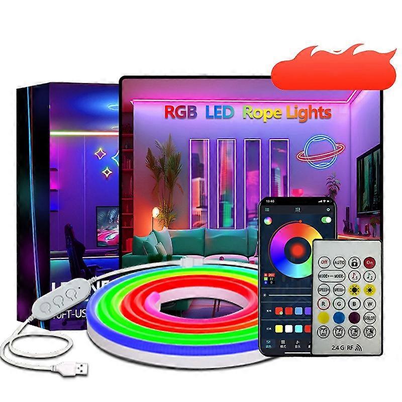 Dynamisk RGBIC-belysning: Upplev levande och anpassningsbar belysning med RGBIC LED neon strip. Denna strip har individuellt adresserbara lysdioder, vilket möjliggör en fantastisk uppsättning färger och dynamiska ljuseffekter. Perfekt för att skapa fängslande stämningar i speluppsättningar, vardagsrum eller vilket utrymme som helst där du vill lägga till en touch av personlig belysning. RGBIC-tekniken säkerställer smidiga färgövergångar och gradienter, vilket förbättrar den visuella attraktionen i din miljö. Använd den för att framhäva arkitektoniska detaljer, skapa anpassade skyltar eller helt enkelt lägga till en färgklick i din vardag. Möjligheterna är oändliga med denna mångsidiga och visuellt slående LED-strip. Flexibel DIY-design: Släpp loss din kreativitet med den flexibla silikonkonstruktionen av denna LED neon strip. Böj och forma enkelt stripen för att skapa anpassade mönster, logotyper eller dekorativa accenter. Det böjliga materialet möjliggör sömlös integration i olika ytor och konturer, vilket gör den idealisk för DIY-projekt och personliga belysningsinstallationer. Oavsett om du skissar möbler, skapar upplysta konstverk eller lägger till en unik touch till din spelrigg, erbjuder denna flexibla LED-strip oöverträffad mångsidighet. Silikonmaterialet är också vattentåligt med en IP67-klassning, vilket gör den lämplig för både inomhus- och utomhusapplikationer. Njut av friheten att designa och anpassa din belysning med denna innovativa och anpassningsbara LED-strip. Bluetooth & Fjärrkontroll: Ta full kontroll över din belysningsupplevelse med Bluetooth-anslutningen och den medföljande 2.4G fjärrkontrollen. Justera sömlöst färger, ljusstyrka och belysningslägen från din smartphone eller den praktiska fjärrkontrollen. Bluetooth-funktionaliteten möjliggör trådlös styrning och anpassning, medan fjärrkontrollen ger snabb åtkomst till förinställda ljuseffekter och färgalternativ. Synkronisera LED-stripen till din favoritmusik och se hur ljusen da