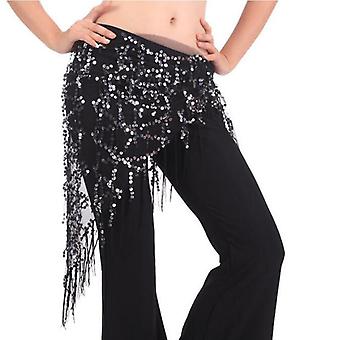 Lady's Belly Dance Sequins Triangle Hip Scarf With Tassel Black Silver