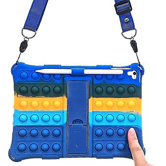 Find Model Number on Tablet Back ---- Compatible with iPad (9th generation) 10.2 inch - 2021 release model: A2602/A2603/A2604; (8th generation) 10.2 inch - 2020 release model: A2270/A2428/A2429/A2430; (7th generation) 10.2 inch - 2019 release model: A2197/A2200/A2198 Compatible with iPad Pro (10.5-inch) 2017 release model:A1701/A1709 Pop It Tablet Case ---- Not like regular push in and out pop its set, when you push the bubbles on our tablet case, it will pop back slowly with a little sound, this design ensure that you don't need to take off the case to play the popping again Multi-functional Tablet Case ---- built-in flat foldable vertical kickstand for handle-free viewing; adjustable lanyard allows you to carry your tablet like a bag; pencil Holder to hold your stylus Pen during drawing 4 Corner Air Cushion popper Case ---- silicone covers on front edge and back, offer bumper protection on your tablet (silicone is washable, wash it with soap when it get dirty) Colorful Bubbles Designed ---- Rainbow case in dark green, navy blue, Orange, light blue, gray, a great fidget sensory Christmas gift for kids boys to have fun and men to relive stress, boredom and anxiety (Package Include: 1 x silicone bubble case, 1 x lanyard, kindly notice, pencil in picture is not included)