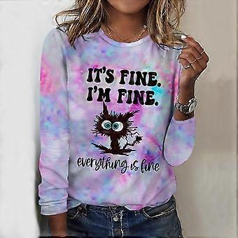 Tops For Spring&Autumn Gradient Cat Print Round Neck Long Sleeve T-shirt Fall Casual Slim Pullover Women's Long Sleeve Top