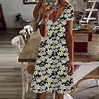 Summer Fashion Women's V Neck Short Sleeve Black Daisy Printed Dress Sex Dress