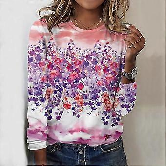 Tops For Spring&Autumn Trees Flowers Print Round Neck Long Sleeve T-shirt Fall Casual Slim Pullover Women's Long Sleeve Top